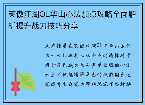 在《笑傲江湖OL》中,华山派作为一大门派,其心法加点的选择对于提升角色战力至关重要。合理的心法加点不仅能增强角色的技能输出,还能提升生存能力,帮助玩家在各种挑战中占据优势。本文将从四个方面深入解析华山心法加点的技巧和战力提升策略。首先,文章会探讨心法加点的基本原则,包括如何选择主攻和辅助心法;接着,分析如何通过合理分配心法点数来强化角色的战斗能力;第三部分将介绍如何根据不同战斗场景调整心法搭配,以达到最佳战斗效果;最后,本文还会讨论如何通过华山心法的搭配来提升角色的整体生存能力。通过这些技巧和方法的结合,玩家能够全面提升战力,取得战斗的胜利。